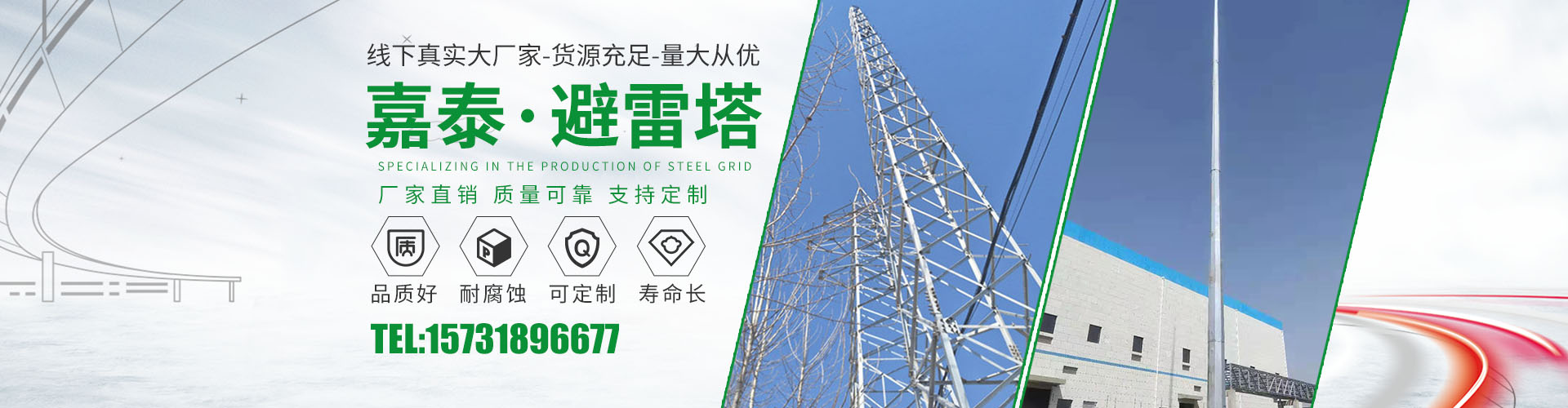 衡水嘉泰鋼結構有限公司位于鐵塔制造之鄉-衡水市景縣廣川經濟開發區,石德、京九鐵路交匯處,距北京、天津、石家莊、濟南均在2小 時交通圈內,交通便利。公司主要產品有:避雷塔、監控塔、瞭望塔、消防訓練塔、電力架構、樓頂工藝塔、廣播電視塔、煙囪塔、測風塔 、電力塔、單管塔、雷達塔、仿生樹塔、氣象觀測塔、路燈桿,一體化基站、ETC龍門架等,是一家集設計,生產,運輸,安裝,維護為一體的廠家。主要服務于鐵塔公司、通信三大運營商、國防通訊,鐵路及森 ......